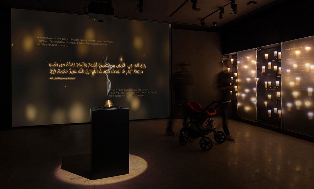 Des espaces de réflexion et de calme sont juxtaposés à des installations multimédias présentant l’étendue de la vie religieuse se servant de la lumière afin de faire le lien entre les espaces mais également en tant qu’élément important dans chacune des différentes religion.