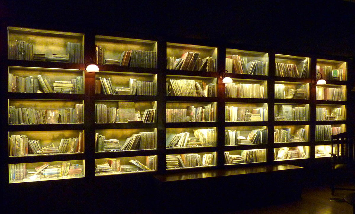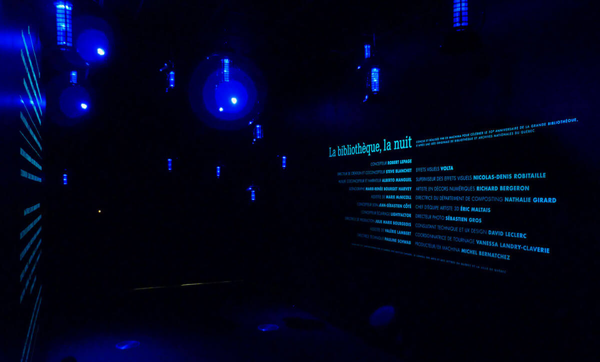 • En préambule, une salle à l’apparence simple nous transporte dans le monde d’Alberto Manguel. Supportée par les éclairages dynamiques, la trame narratrice nous permets de découvrir différents morceaux de l’histoire qui s’y cachent.