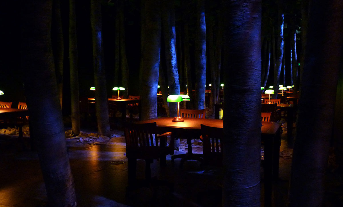 • Par la suite, le public est invité dans une forêt où le feuillage n’est autre que des livres, le tout supporté par un éclairage d’ambiance et immersif, nous faisant perdre complètement l’impression que nous nous situons physiquement à l’intérieur.